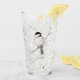 A colour pencil drawing of an adorable chickadee adorns this customisable glass!