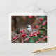 Photo of a chestnut-backed chickadee sitting on a branch with bright red berries and green leaves in the background. A cheerful bird picture with a festive holiday feel for Christmas!