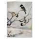 Three black-capped chickadees (Poecile atricapillus) cling to twigs in the middle of a snowstorm in this vintage illustration from 1920. One seems to be wondering why the other is hanging upside-down.