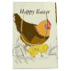 This Easter gift bag features my drawing of a Hen with her two yellow chicks. The front text reads "Happy Easter" and can be changed or removed. Perfect to fill with Easter treats.