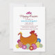 A festive invitation to Easter Brunch and Egg Hunt. The card features a hen with decorated eggs and whimsical flowers. The header has three little hearts and the words "Happy Easter".