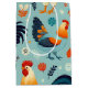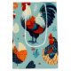 Chickens and Roosters Seamless Pattern Design. Farm animals; Rooster and Hen Graphic Design. White, blue, red, and orange.