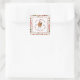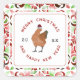 Illustration of a chicken wearing a santa hat. Border is red and green watercolor floral tile pattern design.