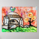 Mixed media art of a chicken sitting on a church with a lemon tree made of lemons
