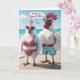 White chickens on the beach wearing swimsuits with a birthday speech bubble and text.