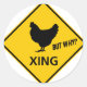 International style road and highway warning sign advising of chicken activity. Includes graffiti asking "But Why?"