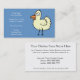 Colour cartoon of a white feathered chicken against your choice of background colour makes this card stand out! The perfect choice for the farmer that sells hatching eggs, chicks, or pullets for meat or eggs. Both sides are customizeable with your own text, The front isfor your product offering, and the reverse side for your contact information.