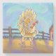 Animal Parade Chicken brought to you by ITD Animal Parade features our original art of a cute yellow and golden chicken standing in a barnyard in front of a red barn and fence with a textured blue sky with a playful wavy purple border. Painted by our talented children's artist, Traci Van Wagoner.