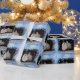 A photo of a group of black and white hens stepping out of a barn doorway into the snow, surround by a border of blue snowflakes.