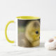 A close up of two yellow, fluffy baby chicks cuddling and looking at each other.
