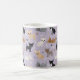 Cute chihuahua dogs with black, brown, tan, cream, grey and blue coats sit and stand scattered dog bones and paw prints on a light purple background.