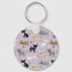 Cute chihuahua dogs in black, brown, tan, cream, grey and blue coats sit and stand scattered dog bones and paw prints on a light purple background.