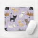 Cute chihuahua dogs in black, brown, tan, cream, grey and blue coats sit and stand scattered dog bones and paw prints on a light purple background.