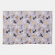 Cute chihuahua dogs with black, brown, tan, cream, grey and blue coats sit and stand scattered dog bones and paw prints on a light purple background.
