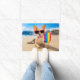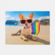 This cute photo features a chihuahua dog at the beach carrying a rainbow colored Gay Pride flag.