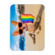This cute photo features a chihuahua dog at the beach carrying a rainbow coloured Gay Pride flag.