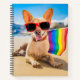 This cute photo features a chihuahua dog at the beach carrying a rainbow coloured Gay Pride flag.