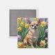 A cheerful dog sits peacefully on lush green grass, surrounded by colourful spring blooms under a soft blue sky. This digital oil painting captures a serene moment with expressive brushstrokes, warm colours, and a sense of gentle joy.