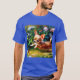 I give wanted to give this a 4 instead of a 5 because these Basic DARK T0shirts run unexpectedly SLIM or Narrow. Which is great if you do not have a potbelly, but I have a paunch. It isn't the shirt's fault that I've got a beer belly. The design and shirt itself is a quality cotton shirt. The color is more of a deep purple, but still a very pretty color. The Basic DARK T-shirts run a bit SLIMMER than the Basic Ts. The neck is a fraction narrower (or seems to be narrower) also. I'm a paunchy middle-aged woman and my neck is 12 inches (31cm) thick and the neckline fell about the same as in the photo of the man, and I had the desire to tug it a bit. So if you're a thick necked man or like loose shirts, be aware these are slimmer shirts. Once I get rid of my lockdown paunch it'll look great. The shirt washed well in cold water with no apparent bleeding. We don't have a dryer, so it hung dry. Did not shrink. Love the colors and the design. The design looks smaller on my shirt than it does on the model on-line. But still, it looks good on the shirt. The printing looks as it does on the model, just the size seems fractionally smaller. Washed garment in cold water, hung dry and design appeared unaffected.