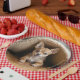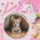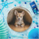 A small tan and white Chihuahua dog peers out with bright expressive eyes from under a fuzzy rug