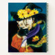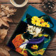 A cute Asian witch holding her chihuahua close while some autumn magic dances around them and some autumn leaves.