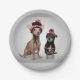 Two Chihuahua dogs wearing funny and cute knitted hats. The bigger Chihuahua is beige / brown and the smaller one is tricolor in black, beige and white. Chihuahua lover photograph image.