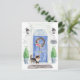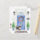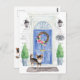 Announce your new address with our stylish announcement featuring a Long Hair Chihuahua, blue front door, welcome mat, slate sign, topiaries and a floral wreath set on a grey brick background.