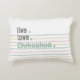 This Chihuahua accent pillow showcases a vibrant, multicolored striped background with the endearing phrase "Live. Love. Chihuahua." The reverse side is a soft yellow hue adorned with a petite paw print, making it an ideal gift for dog enthusiasts, particularly those fond of Chihuahuas. Both the breed and colour are customisable to fit any preference. Its charming and straightforward design adds a touch of whimsy and style to any space, ensuring it will garner admiration as a delightful room accent.