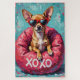 This whimsical retro pop-art illustration features a tiny, confident Chihuahua, rocking oversized heart-shaped sunglasses and sitting on a giant "kiss" beanbag chair. A fun, vibrant, and bold design for Chihuahua lovers this Valentine's Day.