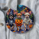 Adorable Chihuahuas dressed in playful Halloween costumes carry pumpkin buckets while trick-or-treating under the moonlit sky. This festive design highlights the breed’s tiny size, big personality, and lively spirit, perfectly capturing the spooky yet fun atmosphere of Halloween night. A charming celebration for dog lovers and Halloween fans alike.
