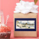 Vintage illustration from a storybook of a child laying on the sand at the beach. His dog swims far out in the waves.