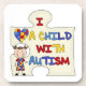 A big puzzle piece, a heart composed of puzzle pieces, a stick figure brunette haired girl, and text that reads "I Love a Child With Autism" on autism awareness T-shirts, mugs, cards, stickers, tote bags, magnets, keychains, journals, mousepads, and other apparel and gift items.