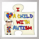A big puzzle piece, a heart composed of puzzle pieces, a stick figure brunette haired girl, and text that reads "I Love a Child With Autism" on autism awareness T-shirts, mugs, cards, stickers, tote bags, magnets, keychains, journals, mousepads, and other apparel and gift items.