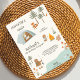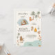 Children's birthday invitation with a camping theme. Features animals like a fox and bear, tent, and campfire. Text reads “Adventure awaits” and gives event details.