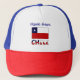 Trucker hat features the Chilean Flag with the word CHILE underneath, in the colours of the flag. Above, a place for your name in blue letters for a cool look or a special, personalised gift. Trucker hat looks great at a family reunion.