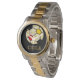 Very good quality watch that looks good whether dressing up or down. The band is sturdy. The watch is rather large so might not work for smaller folks. Recommended as a good gift. Printing is just a touch light but adds a nice touch of personalization.