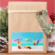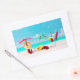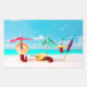 Three red chilli peppers on the beach. Hot sunny day, blue sea, white sand, umbrellas and sombreros. Two peppers are drowsy under beach umbrellas, the third one is waistdeep in the water. Every hour is a happy hour at the beach. Sun, Sea, Sand, Sombrero. Horizontal, landscape orientated products and souvenirs