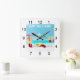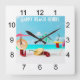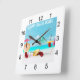 Three red chilli peppers on the beach. Hot sunny day, blue sea, white sand, umbrellas, and sombreros. Two peppers are drowsy under beach umbrellas, the third one is waist-deep in the water. Every hour is a happy hour at the beach. Sun, Sea, Sand, Sombrero. Funny one of a kind square wall clocks.