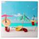Three red chilli peppers on the beach. Hot sunny day, blue sea, white sand, umbrellas and sombreros. Two peppers are drowsy under beach umbrellas, the third one is waistdeep in the water. Every hour is a happy hour at the beach. Sun, Sea, Sand, Sombrero. Square format products and gifts