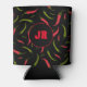 Trendy can cooler printed with hand drawn red and green chilli peppers on black, with a monogram circle on the front to add your name or initials