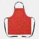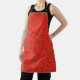 Bright red apron patterned with red and green hand drawn hot chilli peppers, with a monogram diamond on the front where you can add your own initial