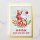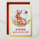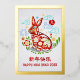 “Happy New Year” red faux foil typography in both Chinese and English and a stunning visual of a graphic multi colour cut paper rabbit with flowers, clouds and stars, overlay a traditional light grey circle pattern and real gold foil border on the front. On the back, a faux gold foil cloud and star visual, along with your personal message, overlay a red circle pattern background. Feel the warmth and joy of the holiday season whenever you send this stylish yet modern, personalised 2023 Chinese New Year of the Rabbit real gold foil greeting card. Make sure someone special receives this greeting!