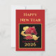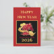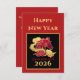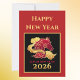 Happy New Year 2026 Lunar New Year's red, gold, and black card with Year of the Horse stylized artwork. The text is customizable if you wish. The front of this card features the text "Happy New Year" and "Lunar New Year 2026" plus a stylized horse among fancy scrolling clouds. The back of this card has gold text: "Wishing you happiness and prosperity. May this New Year bring you good health and good fortune." Make sure to update your family name or remove the name if you prefer to sign with a pen.