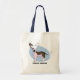 Cute Chinese Crested Hairless tote bag! The dog breed stands in all its glory - tufts of hair on the feet, tail, ears, and head, while the rest is pink dotted skin. Original dog animation is Copyright © Menagerie Mayhem. Blue background. Made especially for Chinese Crested owners.