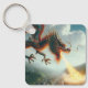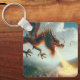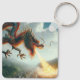 A Chinese style dragon diving down from the sky breathing fire on a small village. By martinspixs.