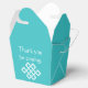 Give your guests, bridesmaids, groomsmen, or anyone else a special treat with these customisable favour boxes featuring a bright turquoise background with a white Chinese good luck knot on the front and back of the box. Both of these sides also feature some sample text that you can customise for your own wedding or event.