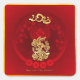 Golden Rabbit paper-cut into a decorated circle with Chinese lantern and Fu ideogram (meaning Luck), blossoms and Chinese greeting into small circles under the Rabbit + "Year of the Rabbit" in hand writing style onto a golden textured paper (image printed). Design on square sticker for Chinese New Year of the Rabbit 2023. Matching greeting card, postcard, square flat card, party supplies and more...
