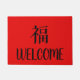 Welcome mat with Chinese design featuring a Chinese character for happiness and good luck. Asian inspired in red and back.