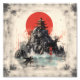 Chinese landscape with little house on high hill and big red sun