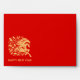 On the front, the text "Happy New Year" appears below the horse, but you can edit it with another short phrase or remove it. The inside features a golden circle abstract pattern on white. The back flap has your or your organization's name and address, but it's fully editable if you just want a name with no address. Decorative firework like symbols also adorn the envelope's flap.